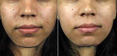 IPL (Intense Pulse Light) is a non-ablative laser for skin conditions ranging from redness, acne scars and rosacea to broken capillaries and hyper pigmentation. The actual IPL Laser procedure feels like the mild snapping of rubber bands against the skin's surface. For best results a Skin Rejuvenation Package is ideal. Expect the dark spots to flake off over the next 7 to 10 days.